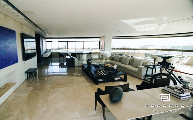 Neste imóvel de 417 m² os moradores contam com 3 suítes com closet, sendo uma máster, ampla sala para 4 ambientes, varanda, cozinha em ilha montada com armários planejados em cinex e bancadas em granito, DCE, despensa, 6 banheiros e 5 vagas para os carros. O alto padrão de acabamento, a linda vista panorâmica da cidade, o hall, a hidromassagem e o home theater completam o imóvel, com maestria.